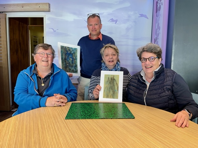 une exposition de peinture d'une adhérente et la présentation du CD des 40 ans les 12, 13 et 14 juillet 2023 Salle Bellevue Danièle Kauffmann artiste peintre, M. Liaudet Presse Océan, C.Robert et S.Blaché ADO, H.Debec Ouest France et Predident des ADO, absent sur la photo À.Guillemer le Courrier du pays de Retz.